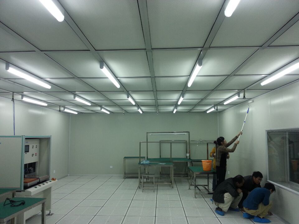 施工單位:凈化車間面積約為1500平方米,凈化要求為百級、千級和萬級,空調(diào)系統(tǒng)方案采用水冷直膨式恒溫恒濕空調(diào)機(jī)組+高效風(fēng)口處理方式,百級采用FFU+AHU方式,工程內(nèi)容含彩鋼板結(jié)構(gòu)裝修,潔凈空調(diào)系統(tǒng),工藝排風(fēng),環(huán)氧樹脂地板,LED照明系統(tǒng),空調(diào)配電及自控系統(tǒng),設(shè)計要求:溫度23±2℃,濕度55±5%,完工后各標(biāo)無塵室指標(biāo)均達(dá)到要求;完工后圖片如下: